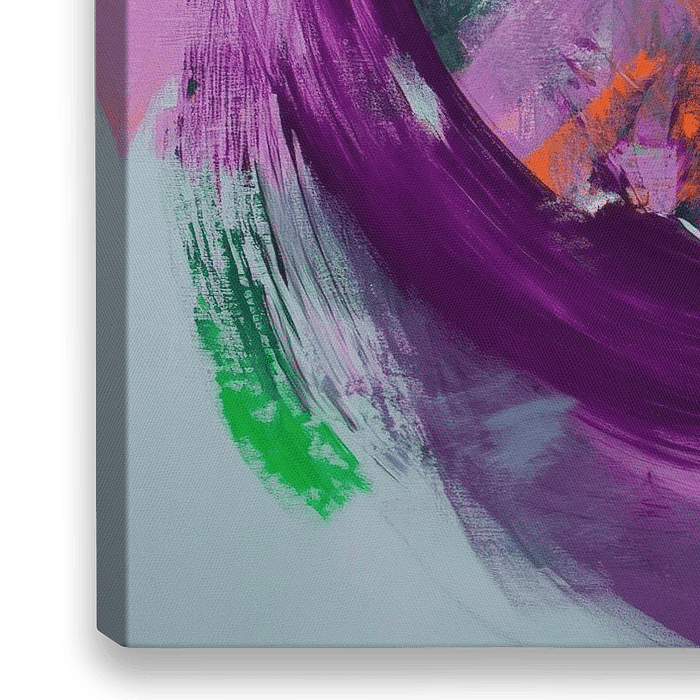 Ein lebhaftes Zusammenspiel aus purpurroten, leuchtend orangefarbenen und sanften grünen Strichen tanzt über die Leinwand und erzeugt ein Gefühl von Energie und Kreativität. Die dynamischen Formen und die kühnen Farben bringen einen Hauch von Frische und Vitalität in jeden Raum, perfekt geeignet für ein kreatives Home Office oder ein…