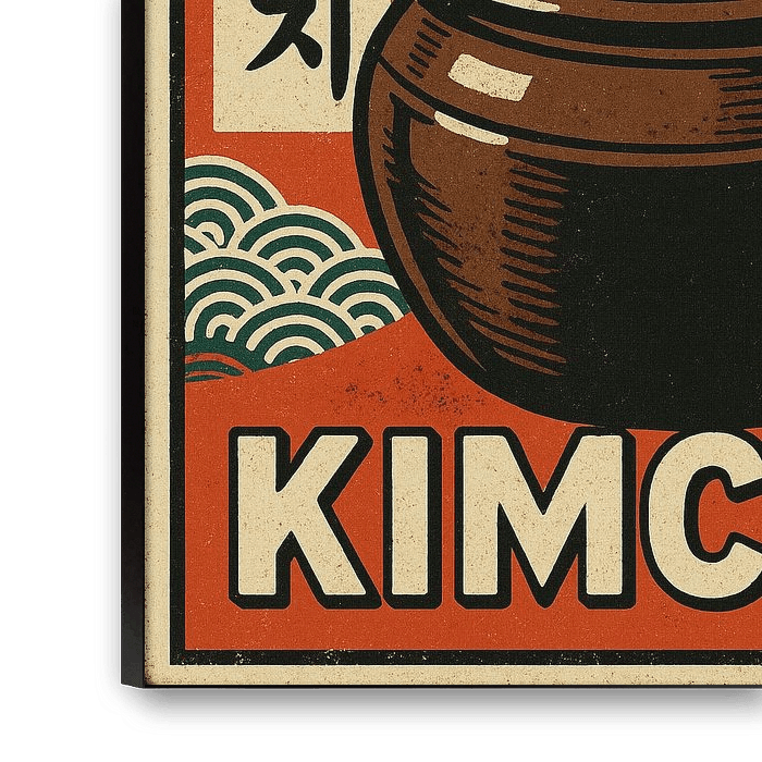 Zelebrieren Sie Koreas kultigste Beilage mit diesem Kimchi-Retro-Poster. In kräftigen Rot- und Grüntönen und mit Vintage-Texturen zeigt das Kunstwerk ein traditionelles Glas mit Napa-Kohl-Kimchi, umgeben von koreanischen Motiven. Kimchi ist nicht nur ein Grundnahrungsmittel der koreanischen Küche, sondern auch ein Symbol für Gesundheit, Tradition und kulturellen Stolz. Der Pop-Art-Stil erinnert an ein Poster aus der Mitte des Jahrhunderts und verleiht ihm eine zeitlose und nostalgische Note. Dieser Druck eignet sich perfekt für Küchen, Esszimmer, Restaurants oder Kunstwände und ist eine auffällige Ergänzung für Essensliebhaber und Kulturinteressierte. Der Used-Effekt verleiht ihm einen authentischen Vintage-Charme und macht es zu einem Sammlerstück der kulinarischen Geschichte. Ideal als Geschenk für Kimchi-Liebhaber, Fans der koreanischen Kultur oder alle, die einzigartige Wanddekorationen zu schätzen wissen. Dieses Kimchi-Poster bringt sowohl Geschmack als auch Kunstfertigkeit in Ihren Raum und zelebriert eines der berühmtesten fermentierten Lebensmittel der Welt.