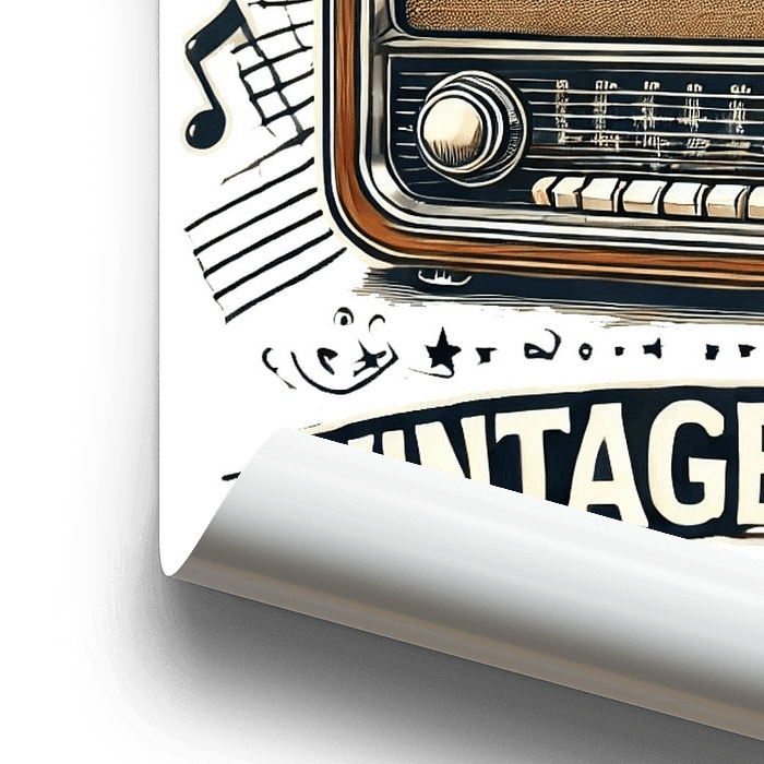Das Poster "Vintage Vibes" fängt den Charme der vergangenen Jahrzehnte perfekt ein. Im Mittelpunkt des Designs steht ein klassisches Retro-Radio mit Antennen und Drehknöpfen, das eine warme Holzoberfläche und stilvolle Chromdetails aufweist. Das Radio ist von musikalischen Noten und Sternen umgeben, die das Gefühl von Nostalgie und musikalischem Genuss unterstreichen.