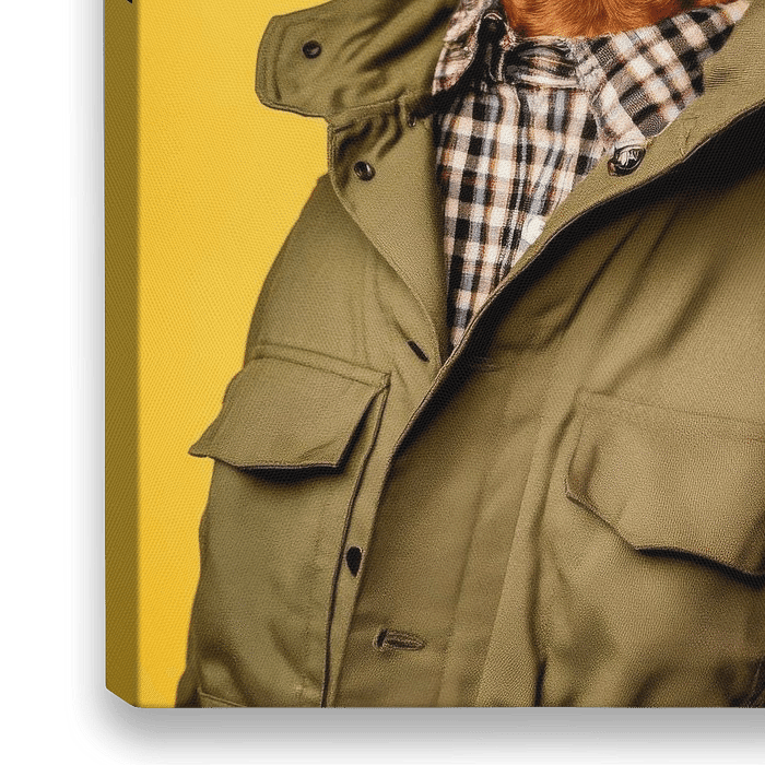 Ein charmantes Wesen mit glänzendem, roten Fell und intelligenter Ausstrahlung. In modischer Jacke und schrägem Cap strahlt dieser Vizsla gleichzeitig Würde und Lebensfreude aus. Sein aufmerksamer Blick und die lebhaften Ohren verleihen einen Hauch von Abenteuerlust, während der gelbe Hintergrund die warmen Farben seiner Persönlichkeit…