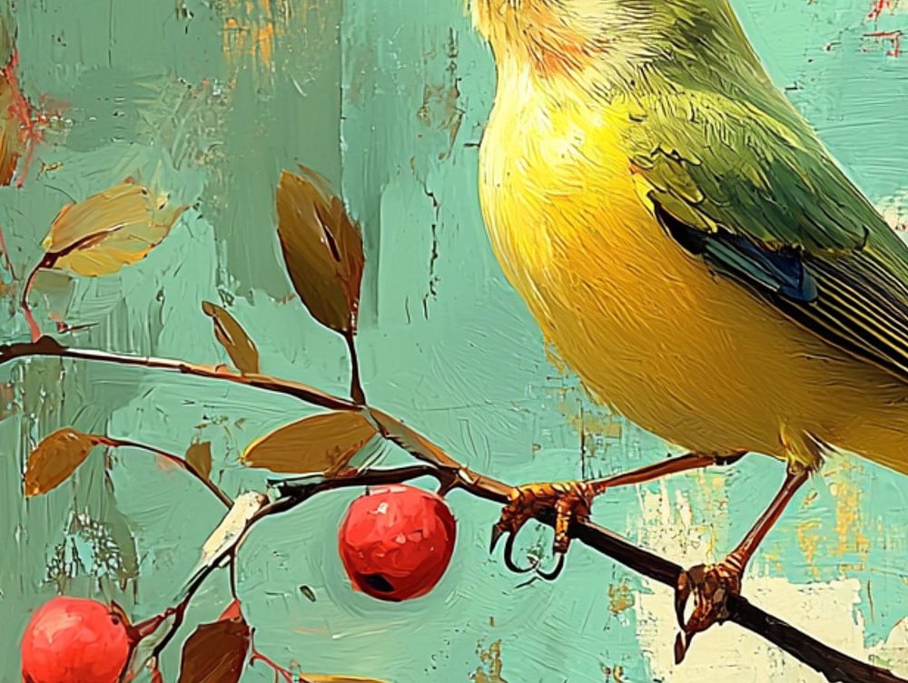 Ein lebhaftes Gemälde zeigt einen kleinen Vogel mit grünem und gelbem Gefieder, der anmutig auf einem dünnen Ast ruht. Die umliegenden roten Beeren leuchten dezent, während weiche Pinselstriche das zarte Gefieder und das verspielte Licht einfangen. Der Hintergrund geht in warme Töne über und lässt den Vogel in der Mitte erstrahlen.