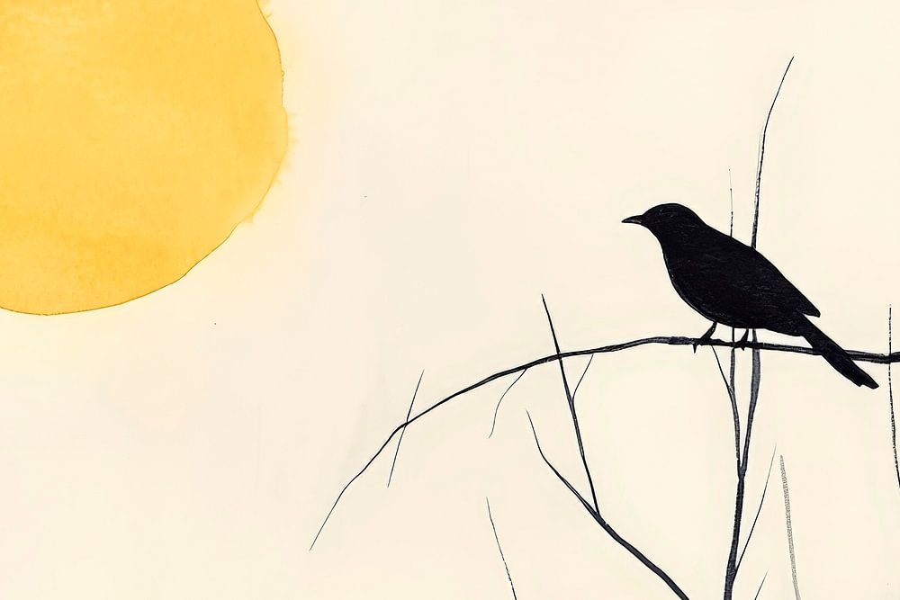 Ein leiser Augenblick der Natur erwacht hier zum Leben: Silhouetten von zarten Ästen schwingen sanft im Vordergrund, während eine strahlend gelbe Sonne den Himmel erhellt. Ein schwarzer Vogel sitzt unwiderstehlich auf einem Ast, als ob er das Licht begrüßt. Ideal für das Wohnzimmer, um entspannende Stimmung und einen Hauch von Freiheit zu schaffen.