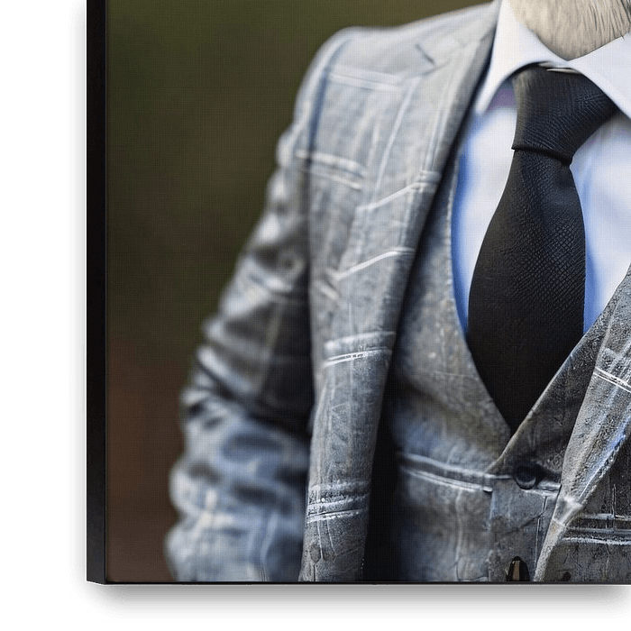 Bestelle dieses Popart-Wandbild Vogel im schicken Anzug von Art & Soul Creations als Reproduktion auf Leinwand, Alu-Dibond, als Poster, Fototapete oder Acrylglasbild.