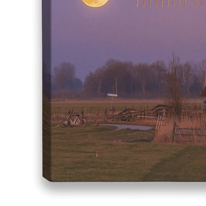Mondaufgang kurz nach Sonnenuntergang bei der Windmühle Koningslaagte, im Naturschutzgebiet Koningslaagte, in der Nähe des Dorfes Zuidwolde, in der Provinz Groningen, Niederlande.
