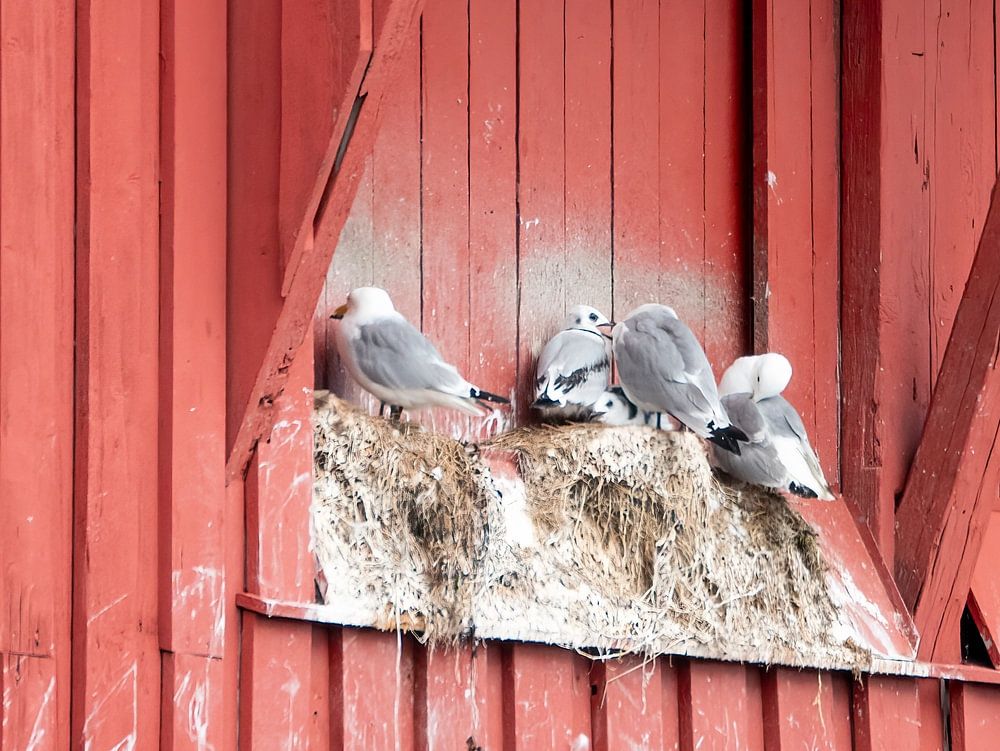 Dreizehenmöwen nisten in Andenes (Norwegen) auf einem Sims eines typisch skandinavischen roten Holzhauses