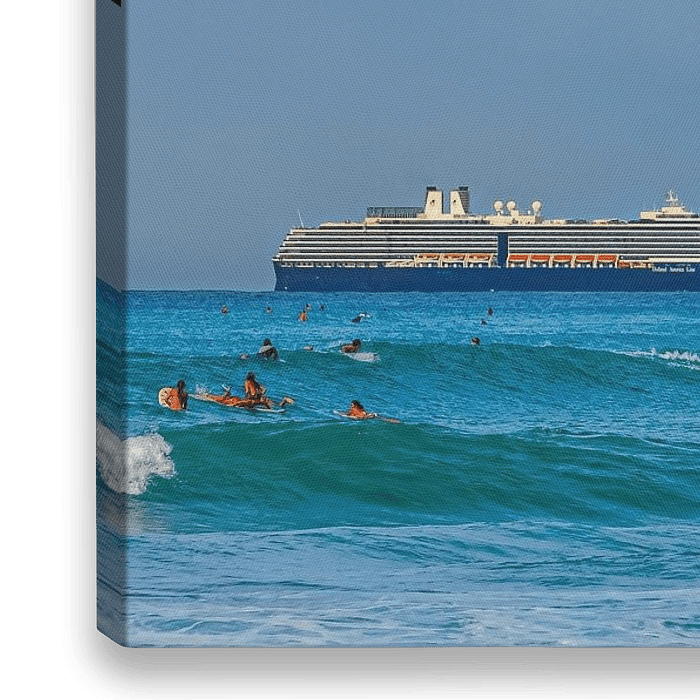 Wasserspaß am Waikiki Beach mit einem Kreuzfahrtschiff der Holland America Line im Hintergrund.