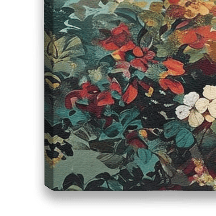 Forest Landscape Art - Dieses Panoramagemälde zeigt eine malerische Waldszene, die Ruhe und Raffinesse ausstrahlt. Es eignet sich perfekt für alle, die einen Hauch von üppiger Natur in eine Vielzahl von Einrichtungsstilen einbringen möchten. Satte Grüntöne werden geschmackvoll mit floralen Akzenten in Rosa, Weiß und feurigem Orange…
