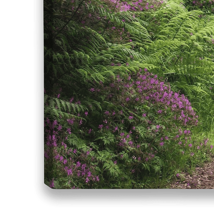 Ein Waldweg mit vielen Blumen am Wegesrand im Nationalpark Garajonay auf der spanischen Insel La Gomera. Durch digitale Bearbeitung wirkt das Bild märchenhaftes und surreal.