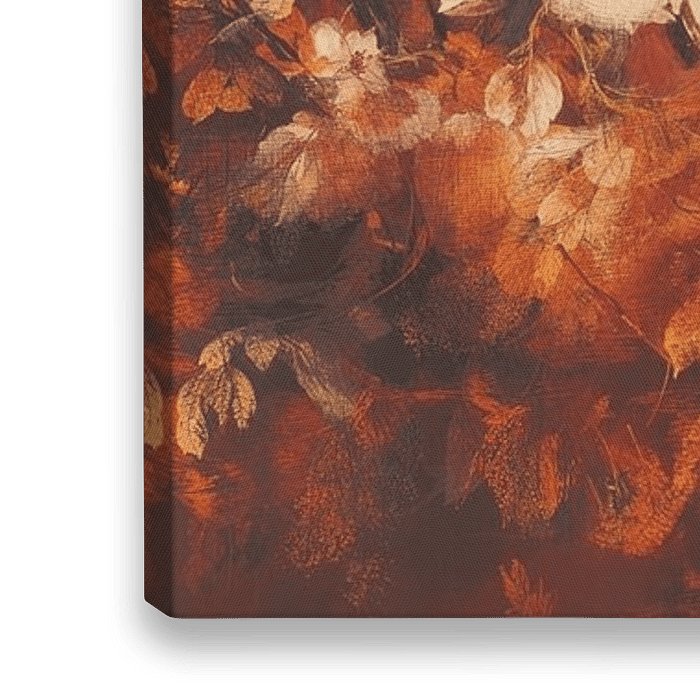 Warme Blume - Dieses Blumenbild zeigt eine üppige Komposition aus zarten, cremefarbenen Blumen, die vor einem warmen, dunkelbraunen und orangefarbenen Hintergrund leuchten und eine lebendige und stimmungsvolle Szene schaffen.