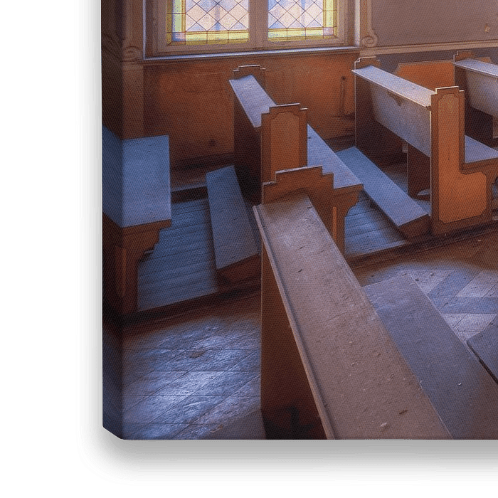 Die Sonne ist gerade erst untergegangen und ein schönes, weiches Licht dringt in die Kirche dieses großen, verlassenen Gebäudes in Polen ein.