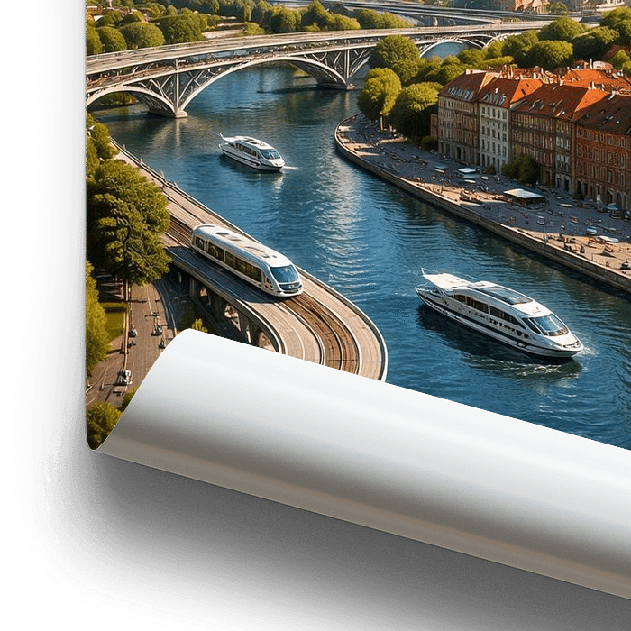 Dieses beeindruckende digitale Poster zeigt eine visionäre Interpretation der Stadt Warschau, in der historische Architektur und futuristische Stadtplanung in perfekter Harmonie miteinander verschmelzen. Im Vordergrund schlängelt sich die Weichsel durch die Stadt, gesäumt von grünen Uferlandschaften, modernen Verkehrswegen und eleganten…