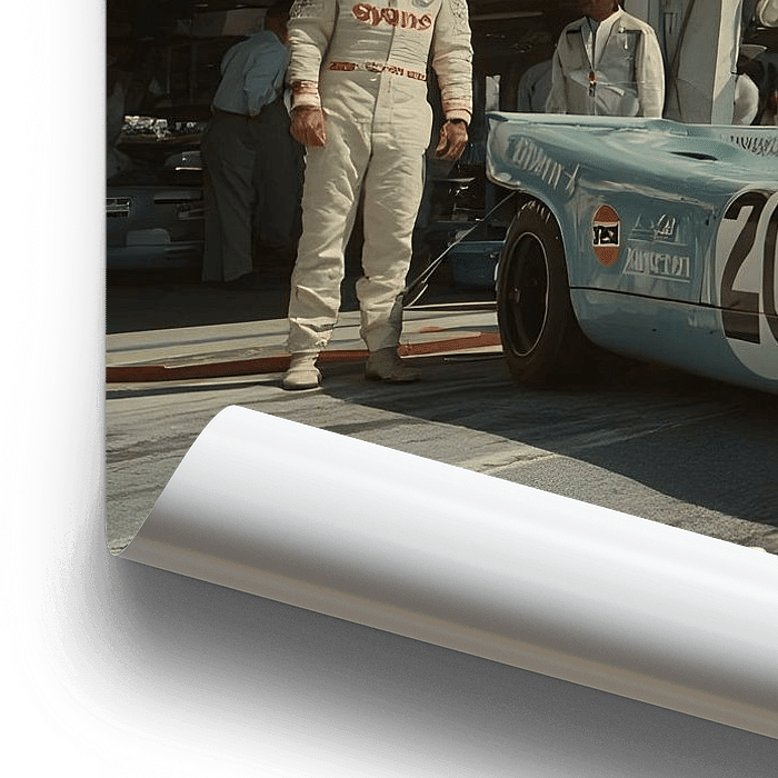 Das ikonische Rennauto mit seiner markanten Silhouette und den unverkennbaren Linien wartet auf seinen Einsatz auf der berühmten Rennstrecke. Mechaniker und Teammitglieder bewegen sich…