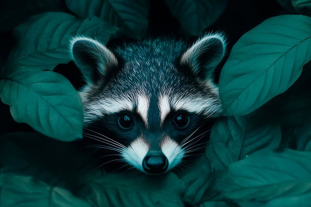 Ein geheimnisvoller Blick schimmert durch das dichte, grüne Blättermeer. Die leuchtenden, maskenartigen Gesichtszeichnungen eines Waschbären ziehen die Aufmerksamkeit auf sich, während die umgebende Vielfalt der Pflanzen in sanften Schattierungen von Dunkelgrün erstrahlt. Dieser scheue Geselle scheint sowohl Beobachter als auch Teil der Natur zu sein, verborgen und doch allgegenwärtig.
