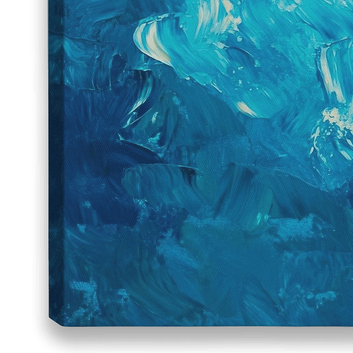 In tiefen Blau- und Türkistönen schimmert die Silhouette einer jungen Frau, deren gelassener Blick in die Weite gleitet. Ihr Haar, verspielt und lebhaft, erinnert an die Wellen des Meeres. Die harmonische Verbindung von Farbe und Form strahlt eine ruhige, träumerische Atmosphäre aus, die die Betrachterin zum Verweilen einlädt.