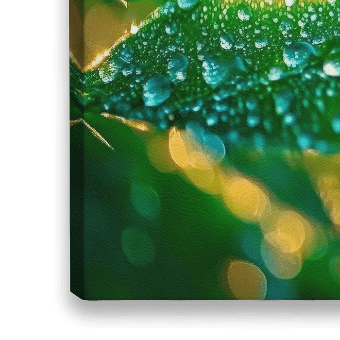 Ein Hauch von frischer Natur entfaltet sich mit funkelnden Wassertropfen, die sanft auf einem Blatt ruhen. Das warme Licht der Sonne durchdringt die Szene und erzeugt ein bezauberndes Spiel aus Glanz und Lebendigkeit. Diese lebendige Darstellung harmoniert perfekt im Wohnzimmer oder in der Küche, wo sie eine einladende, entspannende Atmosphäre schafft.