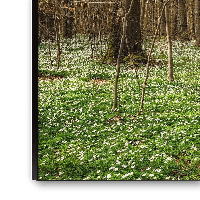 Ein schmaler Weg führt durch den noch laublosen Frühlingswald. Seine Der gesamte Waldboden ist mit Buschwindröschen bedeckt. Die Sonne scheint und schickt ihre wärmenden Strahlen durch den Wald.