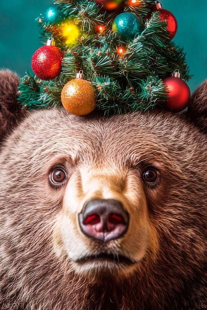 Ein grimmiger Bär mit einem festlichen Weihnachtsbaum auf dem Kopf strahlt eine unerwartete Kombination aus Wildheit und fröhlicher Feiertagsstimmung aus. Die leuchtenden Kugeln und der schimmernde Stern verleihen ihm eine charmante verspielte Note. Dieses einzigartige Kunstwerk wird in einem Wohnzimmer zum absoluten Blickfang und sorgt für eine heitere Atmosphäre.