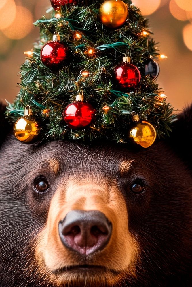 Ein fröhlicher Bär mit einem festlichen Weihnachtsbaum auf dem Kopf strahlt Gemütlichkeit und den Zauber der Feiertage aus. Umgeben von funkelnden Lichtern, bringt dieses charmante Bild eine spielerische Note sowie Wärme in jedes Wohnzimmer. Ideal für eine festliche Atmosphäre, die zum Schmunzeln und Verweilen einlädt.