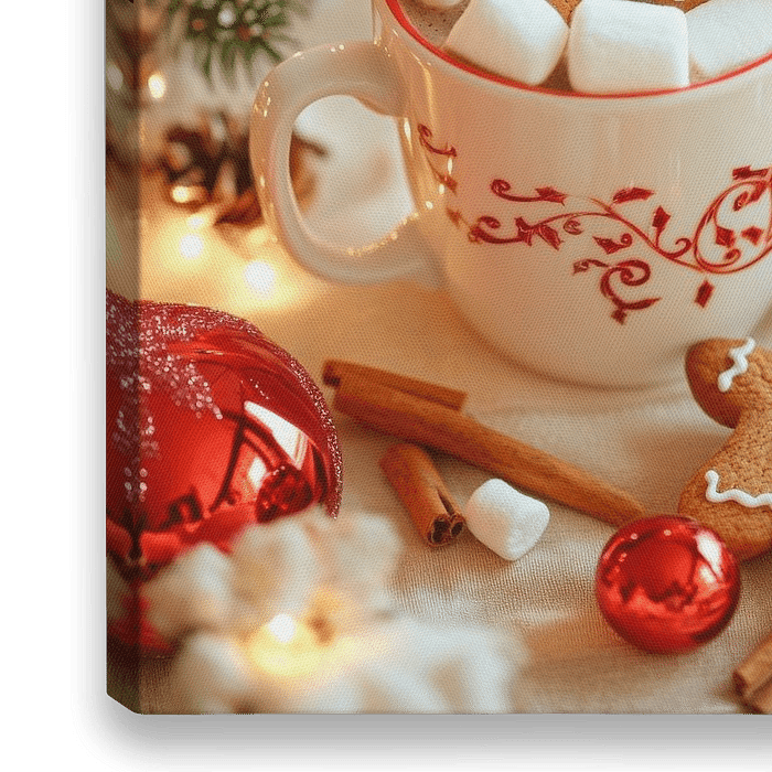 Eine festliche Stimmung entfaltet sich, mit einer warmen Tasse voller cremiger Leckereien und einer süßen Lebkuchenfigur, die auf geschmolzenen Marshmallows thront. Rote und goldene Akzente funkeln im Hintergrund, während der Duft von Zimt und Tannenzweigen die Luft erfüllt. Ein verlockendes Winterwunder, das Gemütlichkeit und Freude…