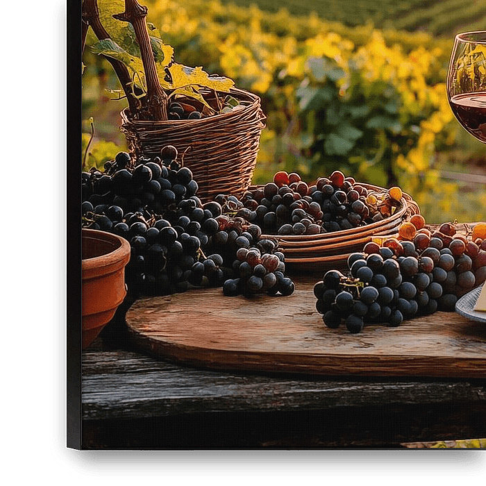 Wein trinken in Italien, in der untergehenden Sonne, mit Blick auf den Weinberg.