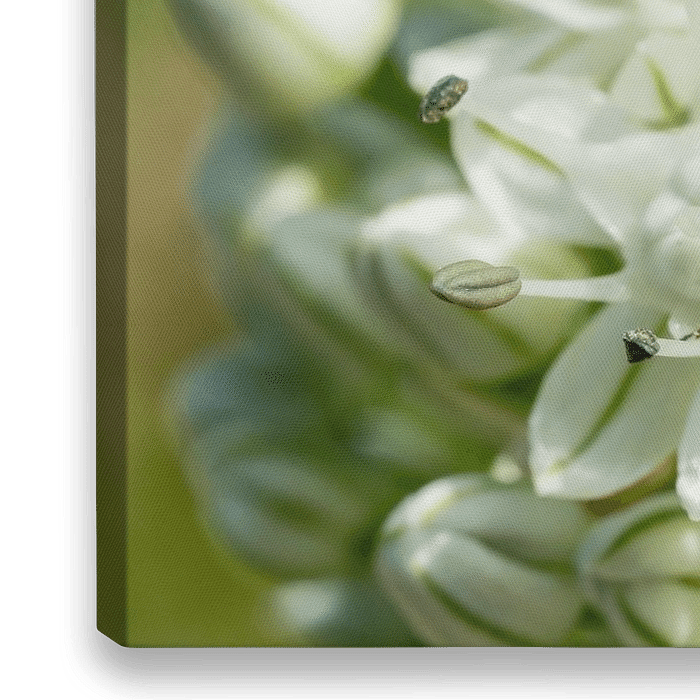 Weiße Blüte einer Zwiebelpflanze mit grünem Käfer, der den Nektar dieser Pflanze genießt. In Belgien. Der Grüne Käfer hat helle, reflektierende Farben.