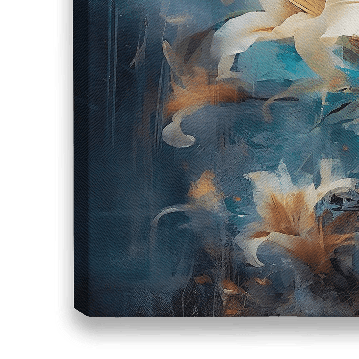 Ein Strauß weißer Lilien mit orangefarbenen Akzenten auf blauem Grund.