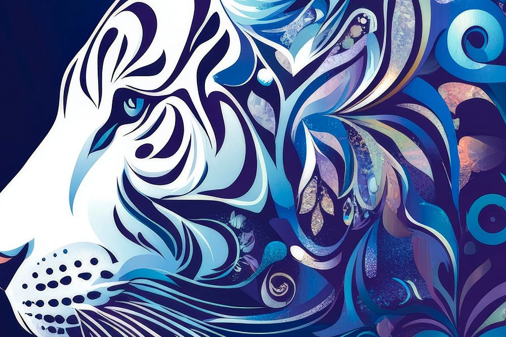 Ein majestätischer weißer Tiger präsentiert sich in lebhaften Blautönen, die in filigranen Mustern fließen. Seine hypnotisierenden Augen ziehen den Betrachter in eine faszinierende Welt. Dieses Kunstwerk verleiht jeder Wand im Wohnzimmer eine dynamische Eleganz und bringt eine beruhigende, aber kraftvolle Energie in den Raum.