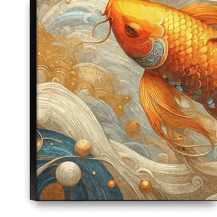 Zwei kunstvoll gestaltete Koi-Fische gleiten durch ein dynamisches Wasseruniversum aus Blau, Gold und Licht. Ihre eleganten Bewegungen symbolisieren Stärke, Harmonie und spirituelles Wachstum. Die goldenen Kugeln und fließenden Wellen verleihen dem texturierten Bild eine mystische Aura, die fernöstliche Weisheit und moderne Ästhetik…
