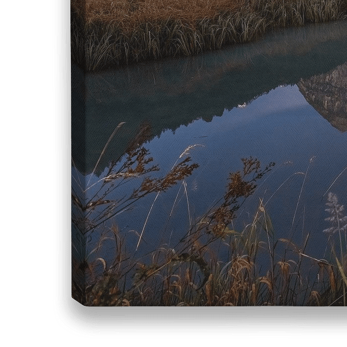 Ein atemberaubender Anblick zur blauen Stunde im Werdenfelser Land, Garmisch-Partenkirchen. Die Waxensteine und der Vollmond spiegeln sich im stillen Wasser. Der Herbst zieht über die Felder und Sträucher, die Bäume des Waldes legen ihr Herbstkleid an. Eine zauberhafte, friedliche Stimmung am frühen Morgen im Oktober. Majestätisch ragen die Waxensteine in den tiefblauen Morgenhimmel und warten auf die aufgehende Sonne.