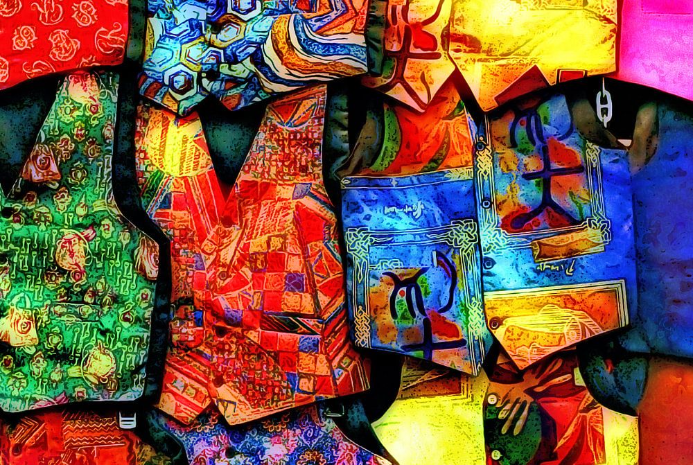 Wand aus bunten Westen an einem Kiosk in London, England