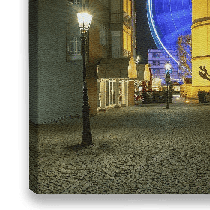 Ein sich drehendes Riesenrad hinter dem Schlossturm auf dem Burgplatz in Düsseldorf.