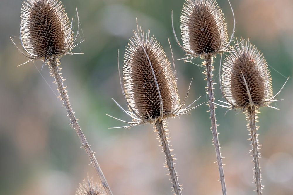 Wenn man gegen das Licht fotografiert, fällt das Licht wunderschön durch die Stacheln der Wilde Karde, so dass ein Lichtkranz um jede Zwiebel entsteht. Das verleiht dieser stacheligen Pflanze eine besondere Atmosphäre.