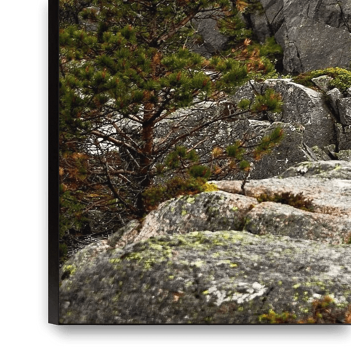 Bestelle das Foto Wildnis auf dem Weg zum Preikestolen in Norwegen während regnerischem Wetter von Stefan Dinse als Reproduktion auf Leinwand, Alu-Dibond, als Poster, Fototapete oder Acrylglasbild.