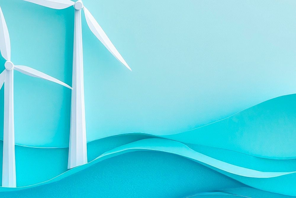 Sanfte Wellen in beruhigenden Türkistönen umrahmen stilisierte Windräder, die von der sanften Brise der Küstenlandschaft flüstern. Diese harmonische Komposition strahlt Frische und Nachhaltigkeit aus und ist perfekt für das Büro, um kreative Gedanken zu fördern und eine positive Arbeitsatmosphäre zu schaffen.