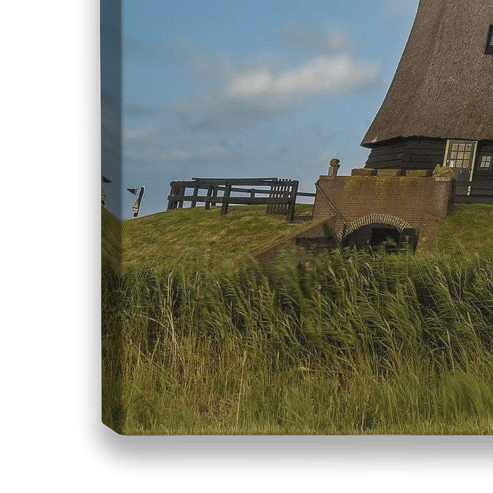 Drei Windmühlen stehen in einer Reihe im nordholländischen Dorf Schermer. Die langsame Verschlusszeit verleiht den Wolken Bewegung.
