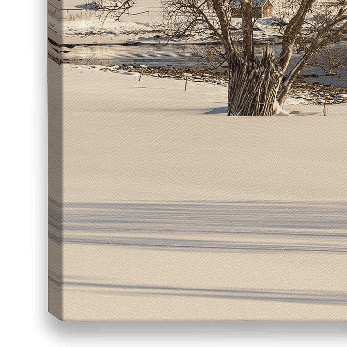 Ein klarer Wintertag in Nordnorwegen auf der schönen Insel Senja. Die Sonne steht tief und wirft lange Schatten über das Land. Ein einsames rotes Bootshaus steht am Wasser.