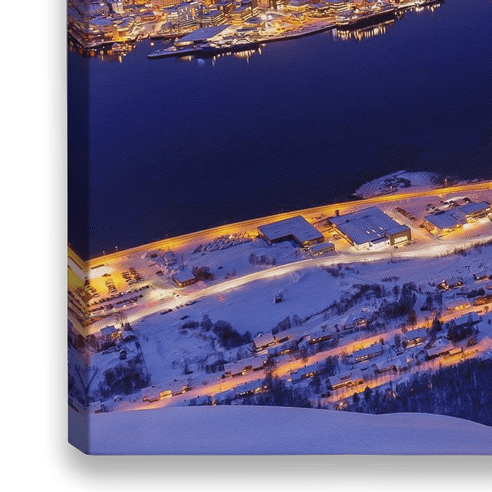 Tromsø ist die größte Stadt in Nordnorwegen. Die Stadt liegt zum größten Teil auf der gleichnamigen Insel. Dieses Bild wurde im Winter vom Aussichtspunkt auf dem Berg an der Bergstation der Seilbahn aus aufgenommen.