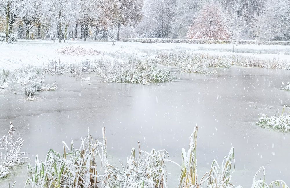 Als der erste Schnee den Park weiß färbt, ist der Herbst noch zaghaft zu erkennen. Diese Kombination macht das Foto zu etwas Besonderem.