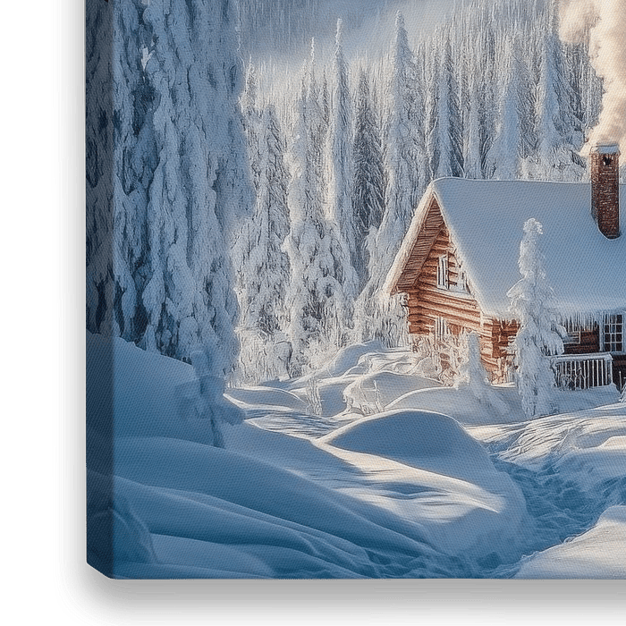 Ein malerisches Winteridyll entfaltet sich vor der Kulisse schneebedeckter Tannen. Einladender Rauch zischt aus dem Kamin und verspricht Gemütlichkeit. Diese Szenerie strahlt Ruhe und Geborgenheit aus, ideal für das Wohnzimmer, wo sie die Seele erwärmen und an lange Winterabende am Kamin erinnern kann.