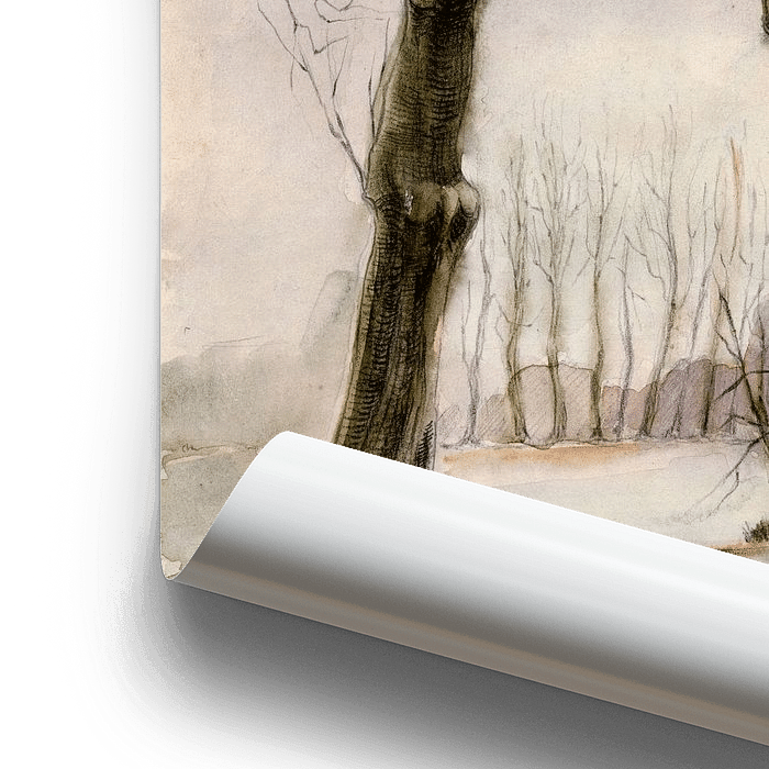 Winterlandschaft mit Bäumen und einigen Häusern im Hintergrund. Feder, Tinte und Aquarell auf Papier des belgischen Malers Pieter Ringoot (1921 - 2011)