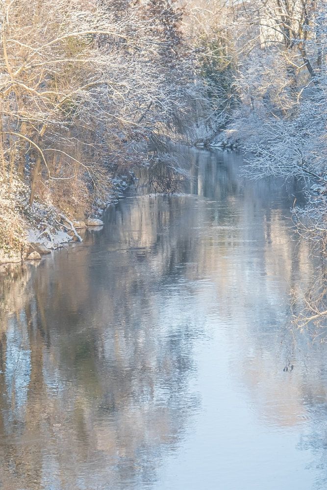 Wintertraum: verträumte Winterlandschaft mit Landschaft und Bäumen am Fluss mit Schnee und Spiegelung im Bach