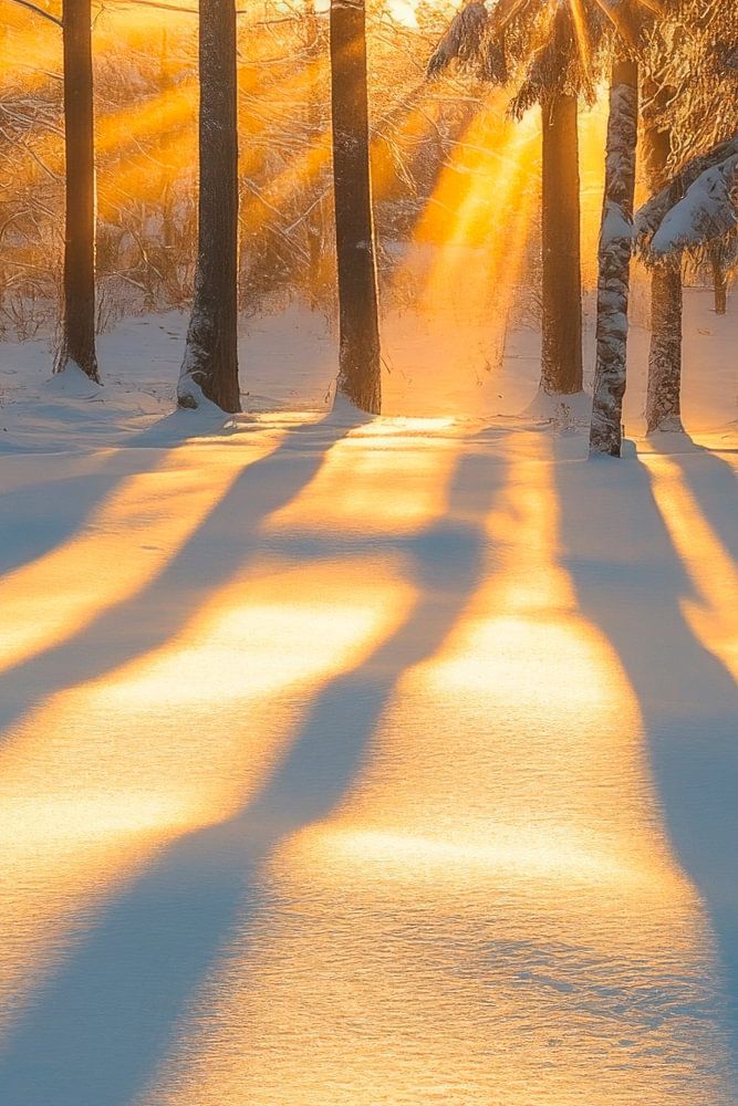 Die sanften Strahlen der Morgensonne durchdringen das schneebedeckte Waldinnere und zaubern ein magisches Lichtspiel auf die glitzernde Fläche. Lange Schatten der Bäume strecken sich elegant über den frisch gefallenen Schnee und laden zu einer besinnlichen Wanderung ein. Eine ruhige, fast surrealistische Atmosphäre umhüllt diesen winterlichen Traum, der zum Staunen einlädt.