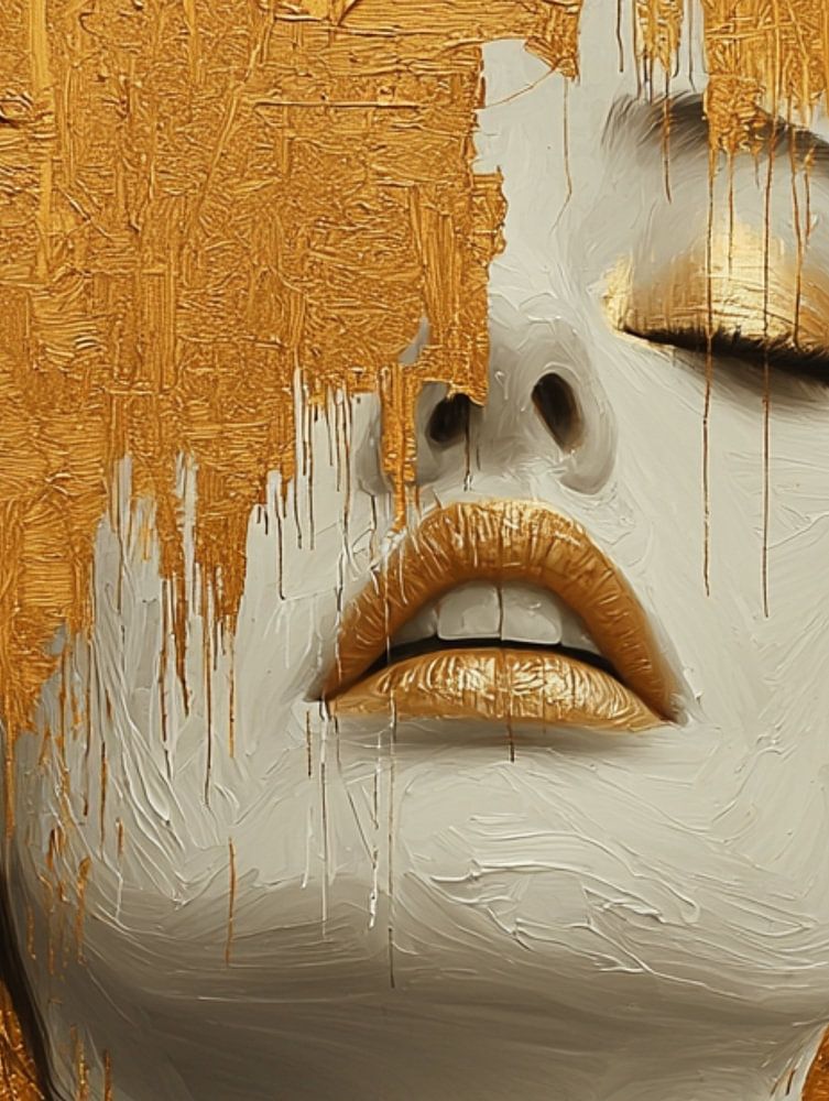 Ein elegantes Gemälde zeigt das Gesicht einer Frau, das von feinen Goldtönen umrahmt wird. Die Farbe fließt anmutig herab, wie flüssige Lichtstrahlen, die ihr weiches Gesicht betonen. Das Wechselspiel von Glanz und Transparenz schafft eine verträumte, fast himmlische Atmosphäre. Ihr Blick strahlt Ruhe, Geheimnis und raffinierte Kraft aus.