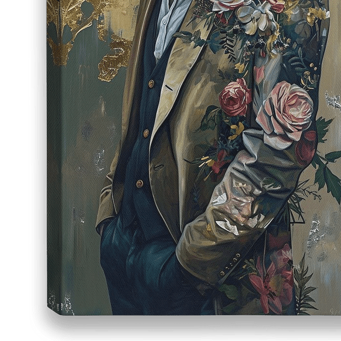 Wolf - Dieses faszinierende Werk zeigt einen Wolf in menschlicher Kleidung, mit Anzug und Blumenbouquet. Die satten, erdigen Farben und die goldenen Details verleihen ihm ein opulentes Aussehen, während die realistische Darstellung des Wolfs eine unerwartete Wendung hinzufügt. Die Kombination aus Tier und Mensch, Natur und Luxus macht…