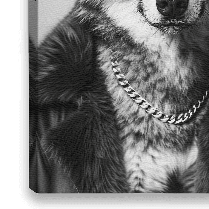 Ein künstlerisches Schwarz-Weiß-Foto eines Wolfes, bekleidet mit einem modischen Hut, Brille und einem gemusterten Hemd. Stylish und einzigartig.