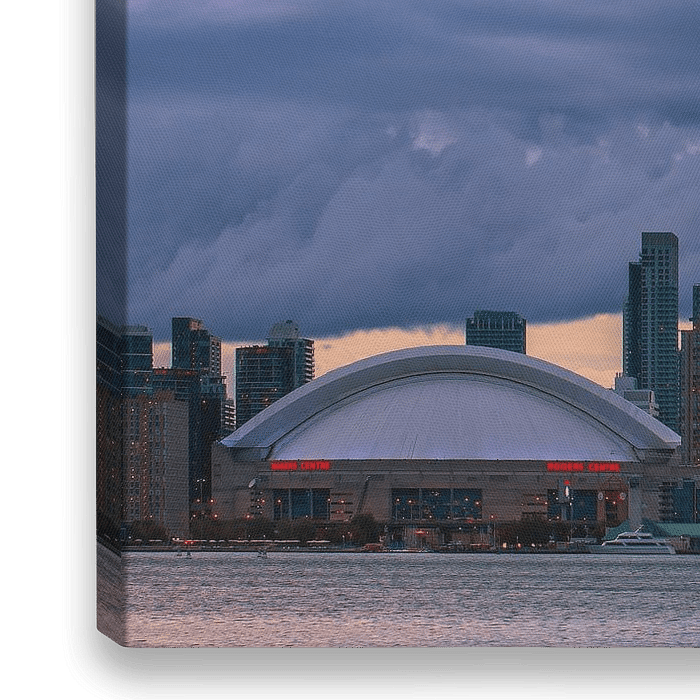 Sonnenuntergang, der Blick von den Toronto Islands auf die Stadt und die Skyline von Toronto mit dem CN Tower und dem Rogers Centre.