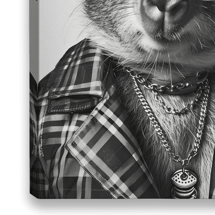 Ein Wombat in einem stilvollen Outfit und Accessoires posiert für ein schwarz-weiß Porträt. Perfekt für kreative und humorvolle Projekte.
