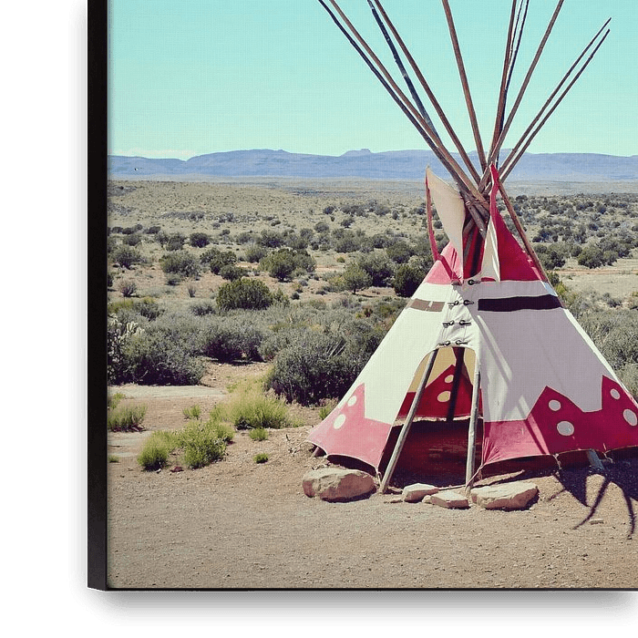 Aufnahme in einer Wüstenlandschaft in der Nähe des Grand Canyon im nördlichen Bundesstaat Arizona, USA. In dieser Komposition ist ein Tipi zu sehen, ein traditionelles indianisches Zelt, das zu den alten Zivilisationen Nordamerikas gehört.