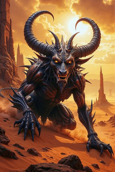 Ein massiver Dämon erhebt sich aus den brennenden Sanden einer endlosen Wüstenlandschaft. Seine gewaltigen Hörner schneiden sich gegen den glutgelben Himmel, während seine Klauen tief in den Sand greifen. Staub wirbelt um seinen Körper, und sein Blick glüht wie geschmolzenes Metall unter der sengenden Sonne.