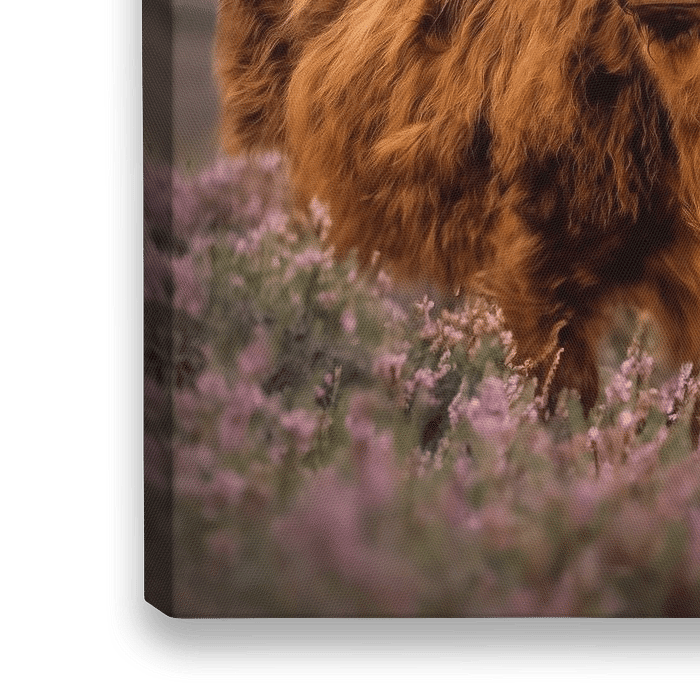 Schöne schottische Highlander-Kuh in lila/rosa Heidekraut